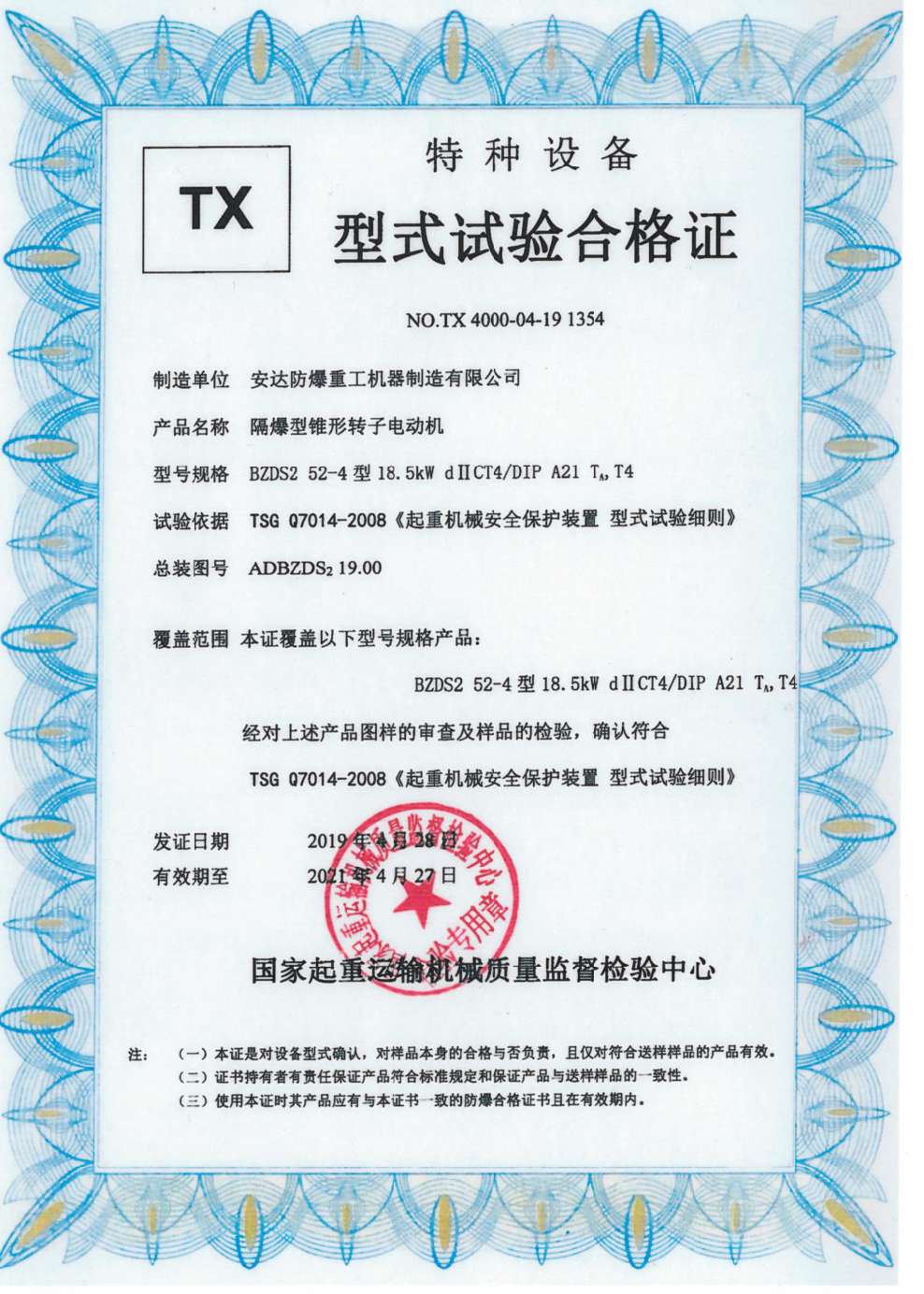 隔爆型錐形轉(zhuǎn)子電動(dòng)機(jī)  TX型式試驗(yàn)合格證