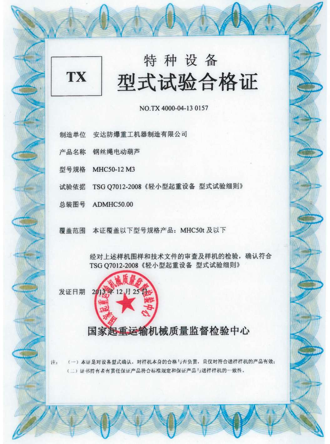 鋼絲繩電動葫蘆 TX型式試驗合格證