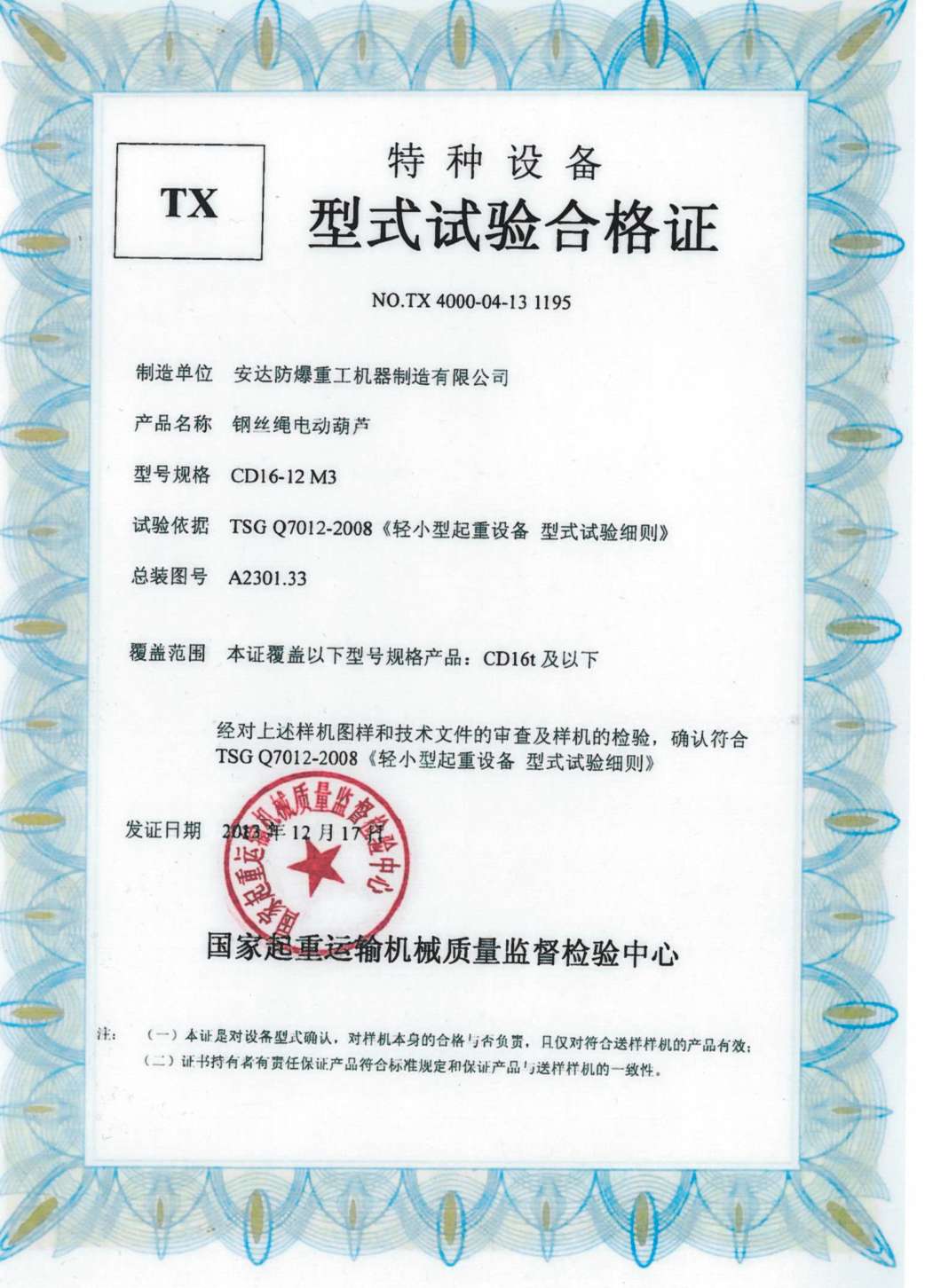 榮譽(yù)資質(zhì) 鋼絲繩電動(dòng)葫蘆 TX型式試驗(yàn)合格證