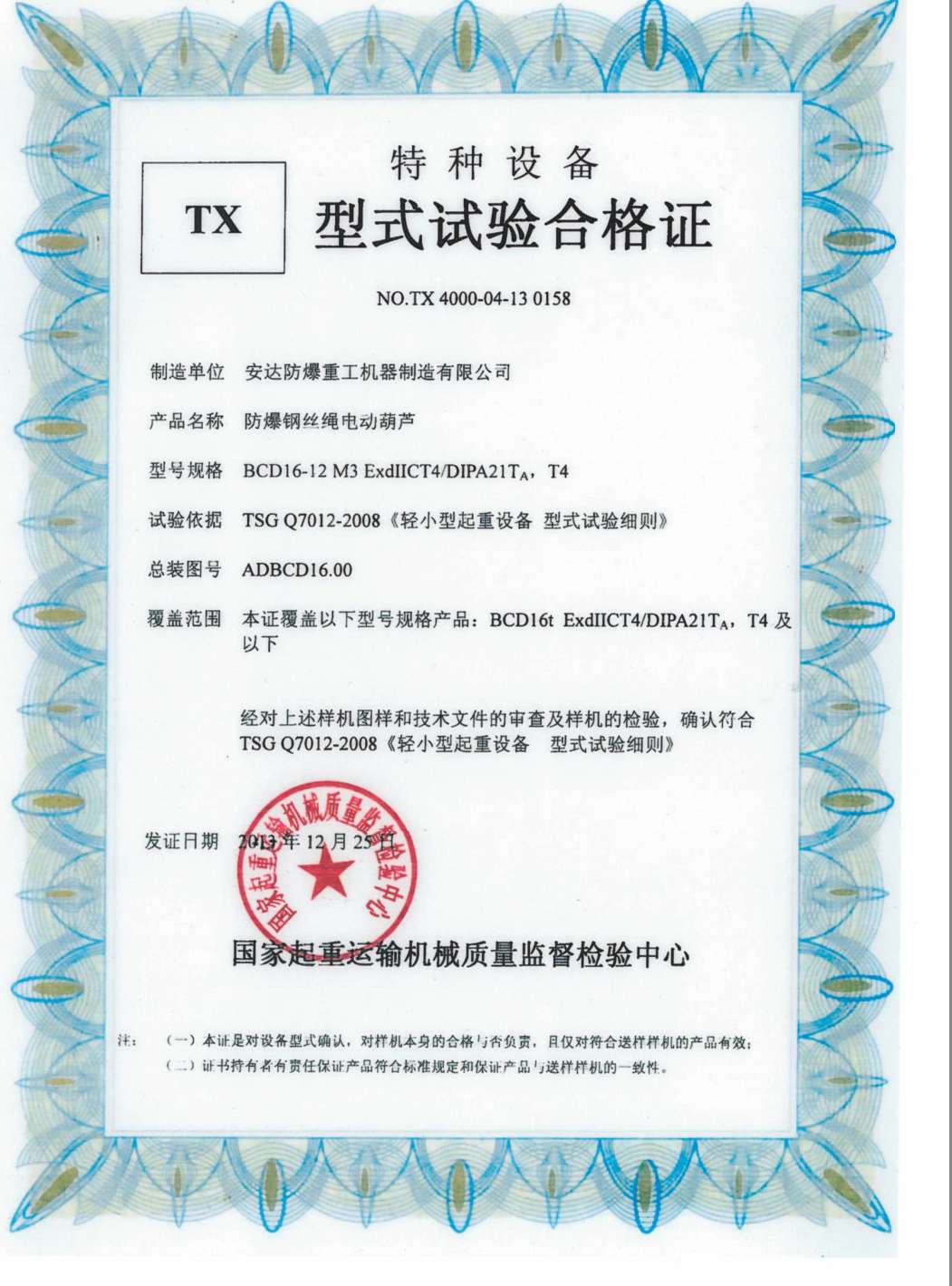 榮譽(yù)資質(zhì) 防爆鋼絲繩電動(dòng)葫蘆 TX型式試驗(yàn)合格證