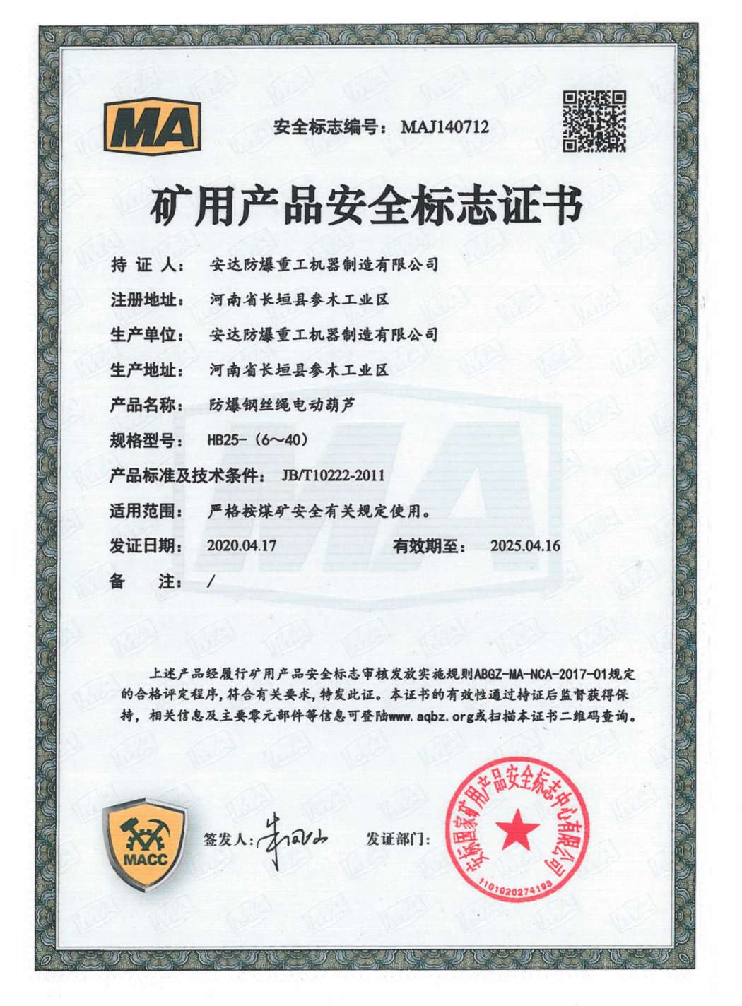 | 發(fā)證機(jī)構(gòu): | 安標(biāo)國(guó)家礦用產(chǎn)品安全標(biāo)志中心有限公司 | 發(fā)證時(shí)間 : | 2020-04-17 |