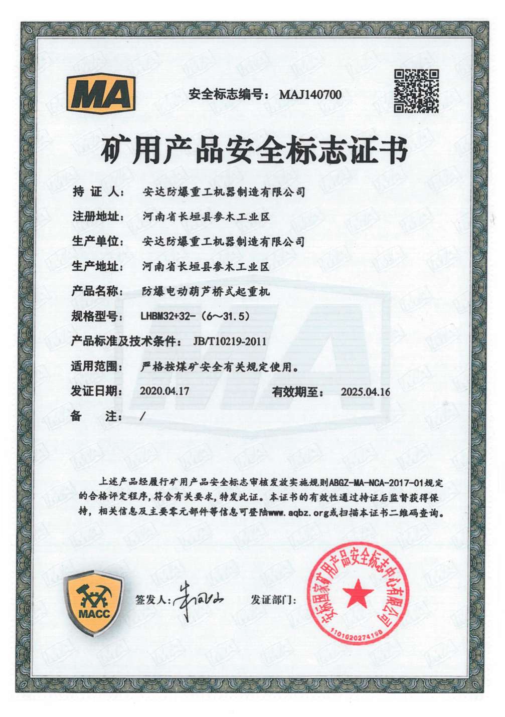 防爆鋼絲繩葫蘆橋式起重機 礦用產(chǎn)品安全標志證書
