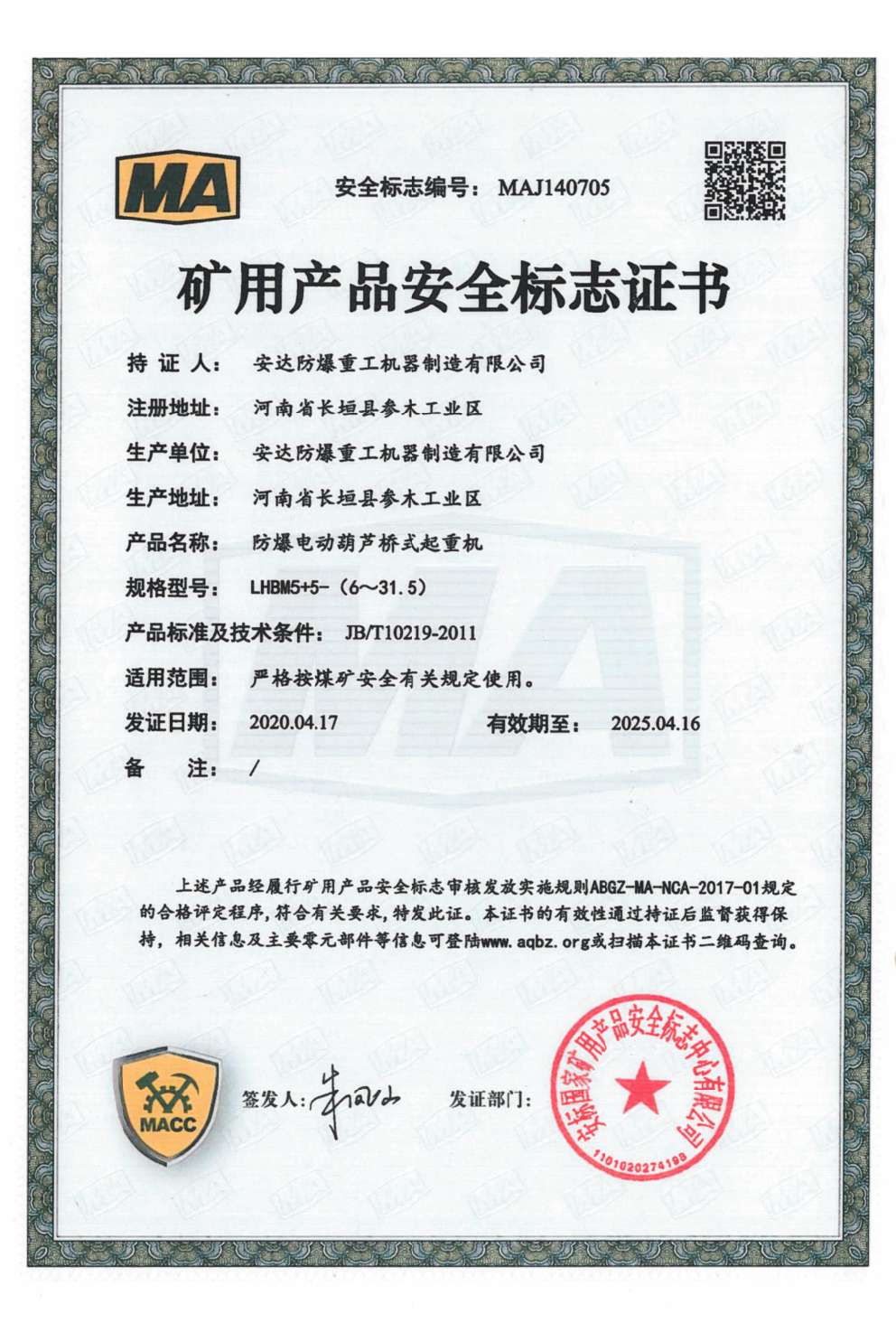 您當(dāng)前的位置:首頁 » 榮譽(yù)資質(zhì) » 防爆鋼絲繩葫蘆橋式起重機(jī) 礦用產(chǎn)品安全標(biāo)志證書