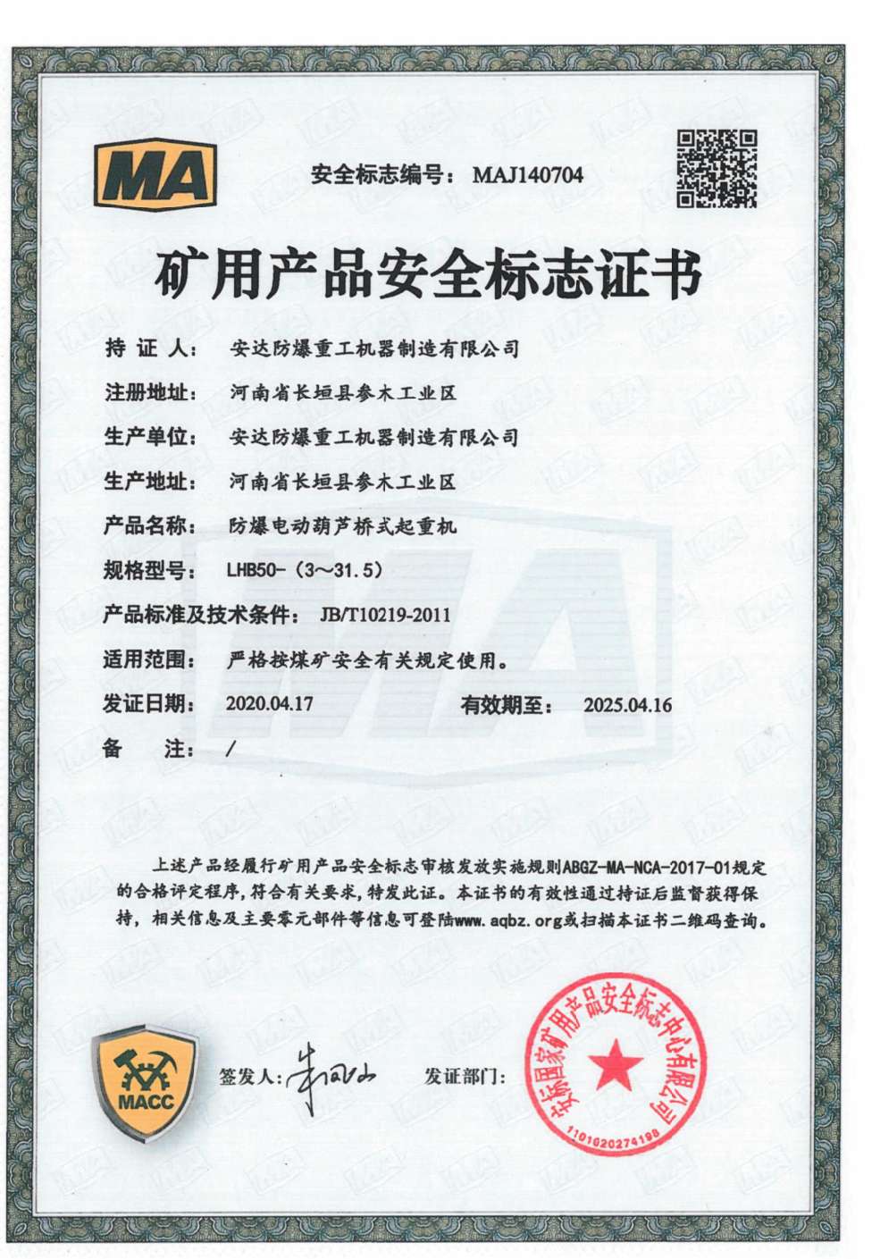防爆鋼絲繩葫蘆橋式起重機 礦用產品安全標志證書