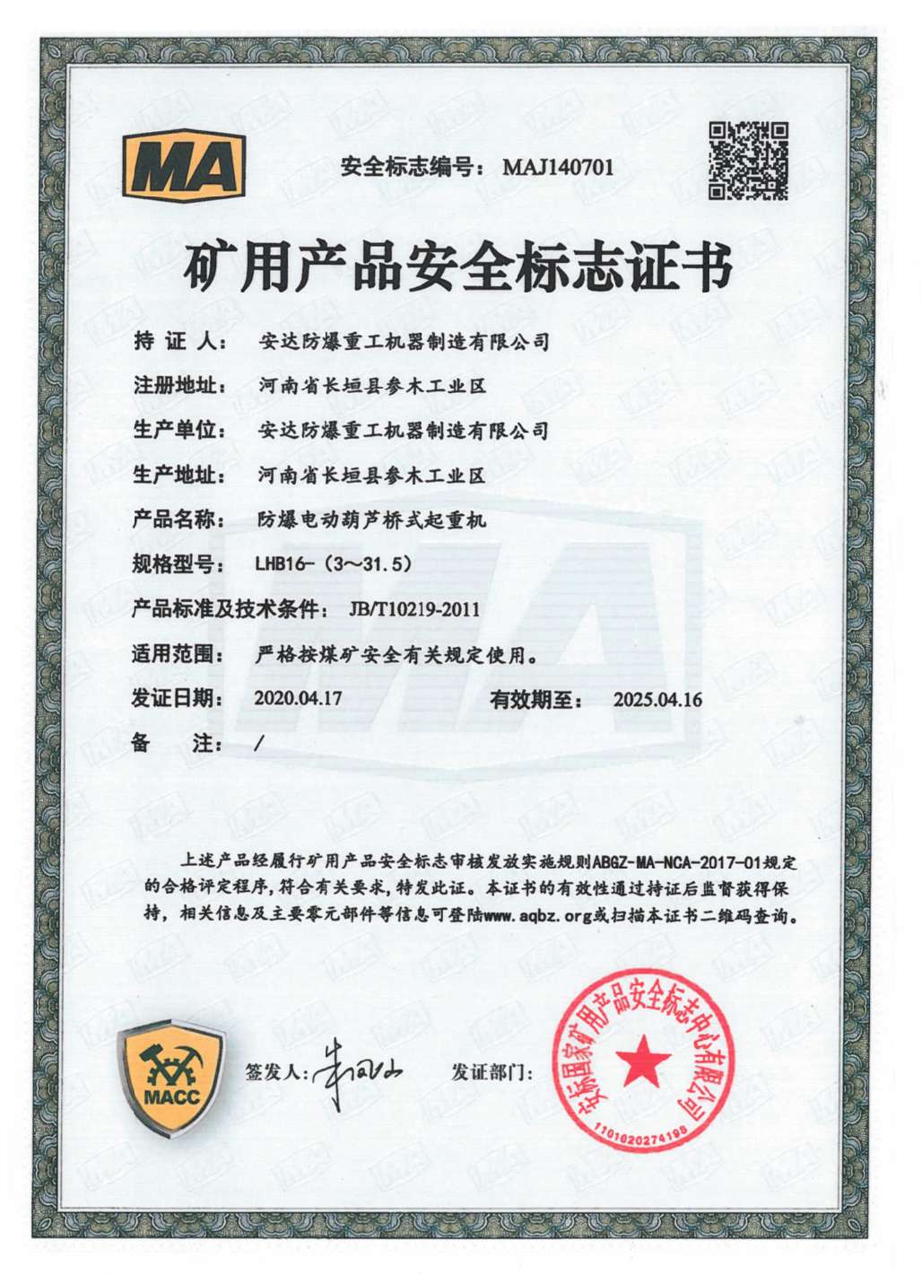 發(fā)證機(jī)構(gòu):   安標(biāo)國家礦用產(chǎn)品安全標(biāo)志中心有限公司 發(fā)證時間 :   2020-04-17