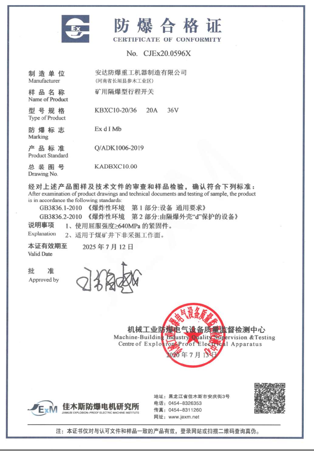發(fā)證機構(gòu):   機械工業(yè)防爆電氣質(zhì)量監(jiān)督檢測中心 發(fā)證時間 :   2020-07-13