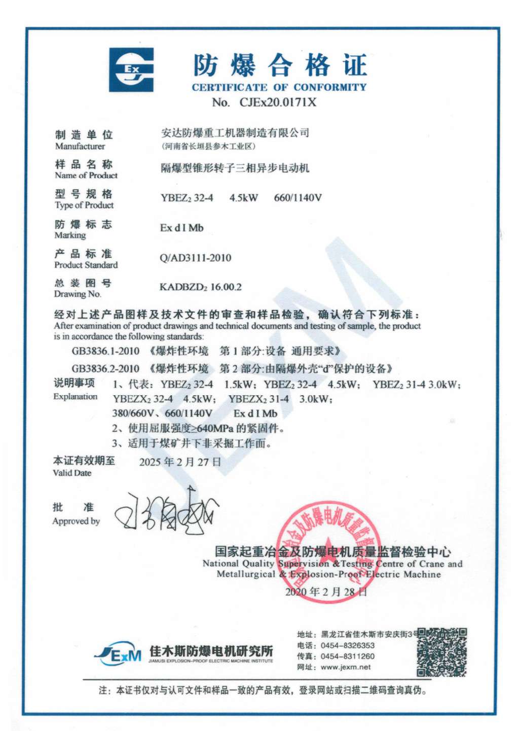 發(fā)證機(jī)構(gòu):   國家起重冶金及防爆電機(jī)質(zhì)量監(jiān)督檢測中心 發(fā)證時間 :   2020-02-28