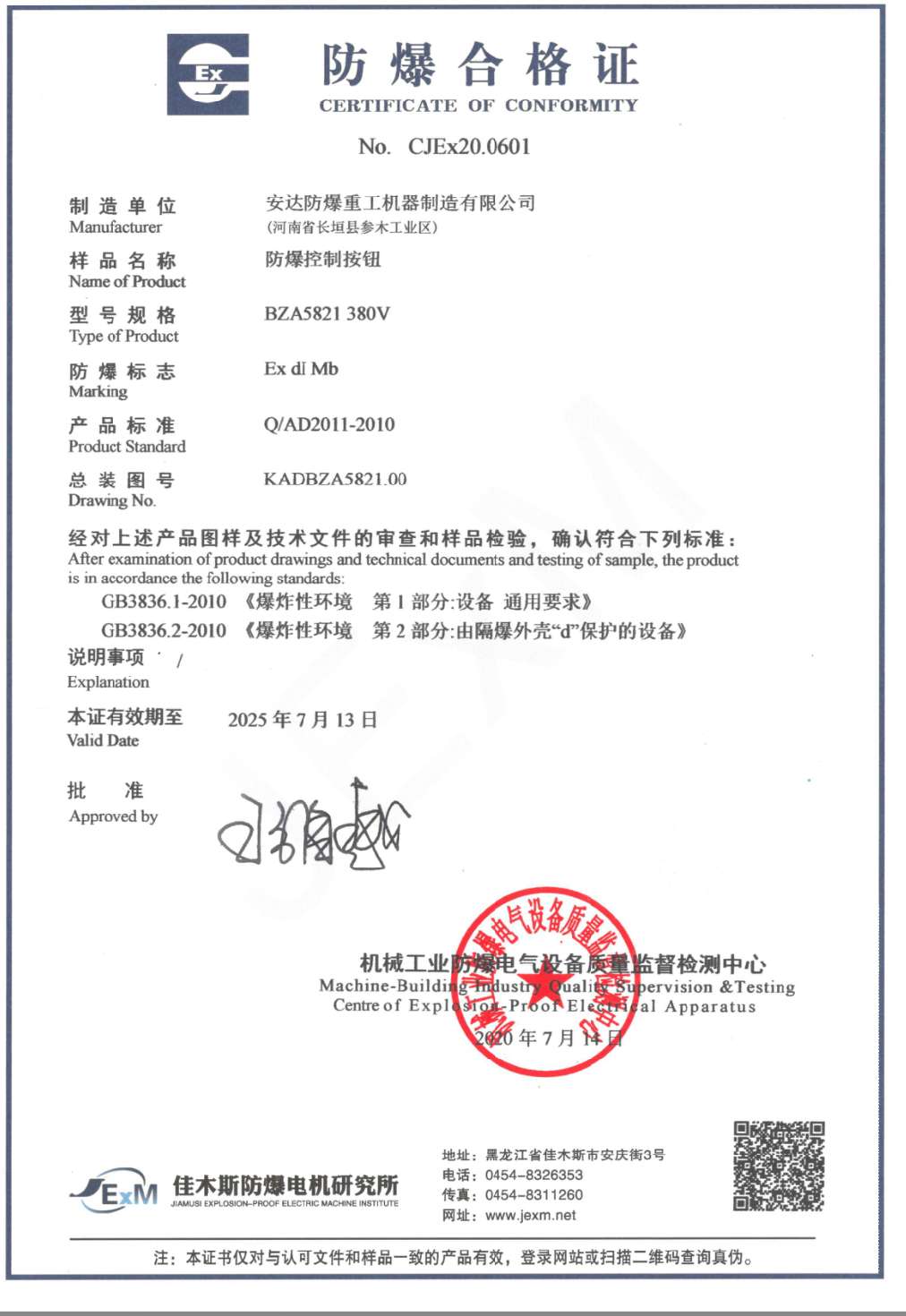 發(fā)證機(jī)構(gòu):   機(jī)械工業(yè)防爆電氣質(zhì)量監(jiān)督檢測(cè)中心 發(fā)證時(shí)間 :   2020-07-14