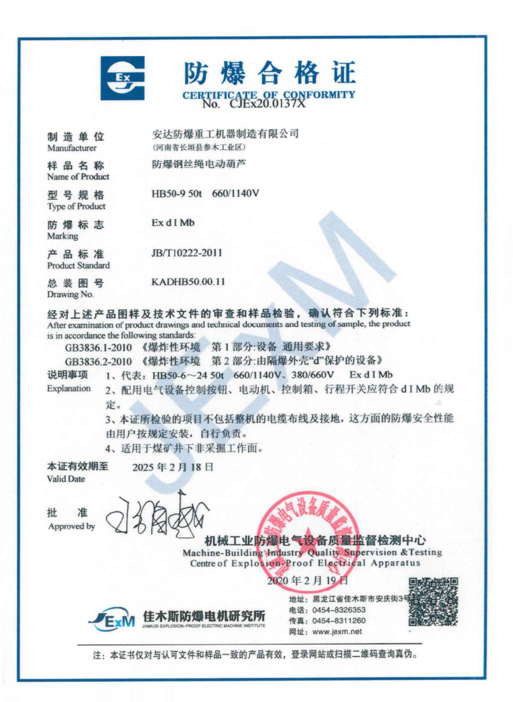 榮譽(yù)資質(zhì) 防爆鋼絲繩電動(dòng)葫蘆 防爆合格證