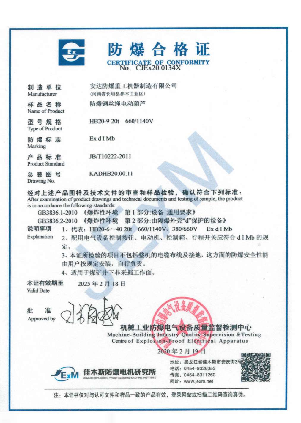 | 發(fā)證機(jī)構(gòu): | 機(jī)械工業(yè)防爆電氣質(zhì)量監(jiān)督檢測(cè)中心 | 發(fā)證時(shí)間 : | 2020-02-19 |