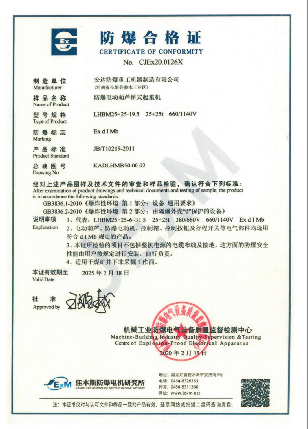 榮譽(yù)資質(zhì) 防爆電動(dòng)葫蘆橋式起重機(jī) 防爆合格證