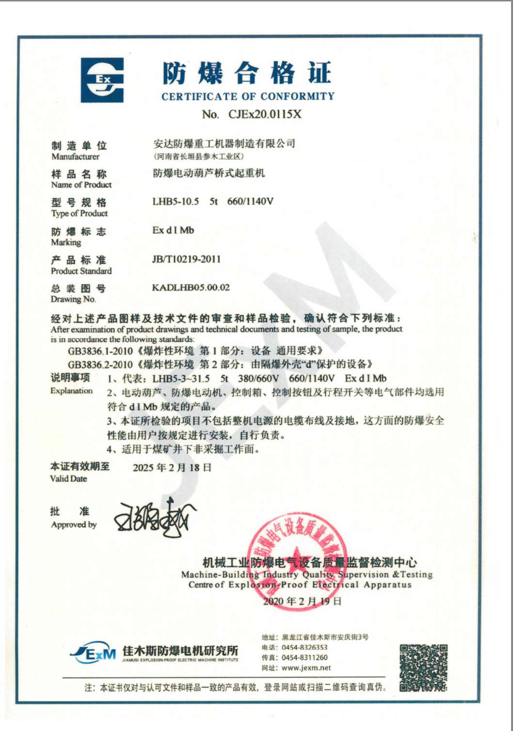 » 防爆電動葫蘆橋式起重機 防爆合格證