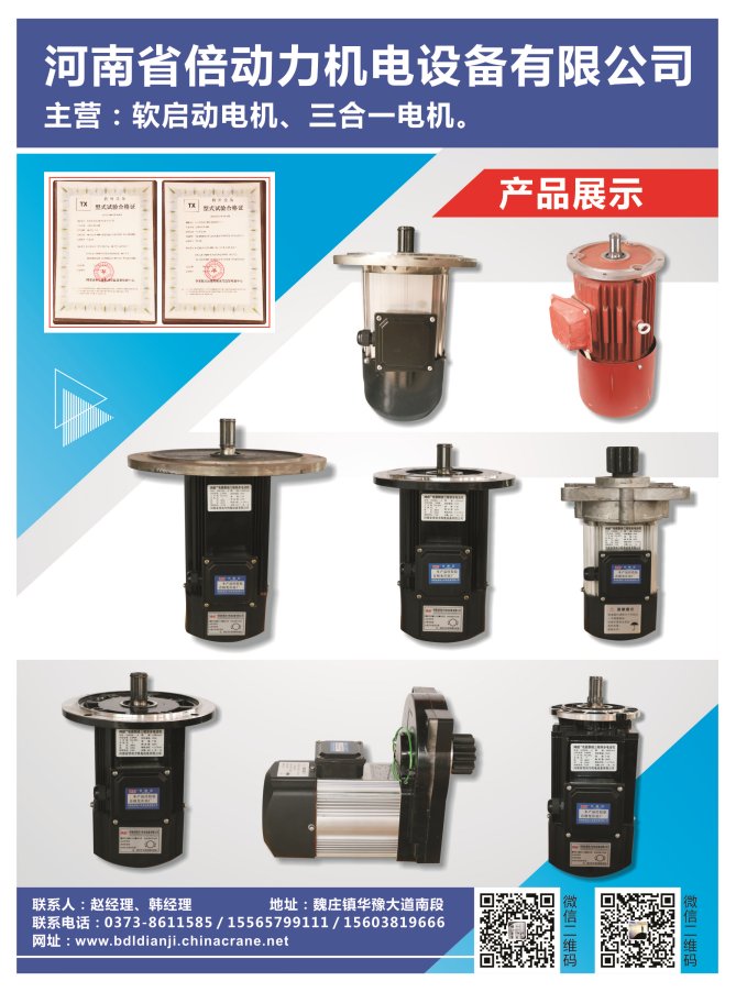 河南省倍動力機(jī)電設(shè)備有限公司,專業(yè)生產(chǎn)軟啟動電機(jī),三合一電機(jī)。配套橋門式起重機(jī),各種型號鋼絲繩電動葫蘆。我們將以放心質(zhì)量,貼心的服務(wù),贏得廣大新老客戶的信賴。