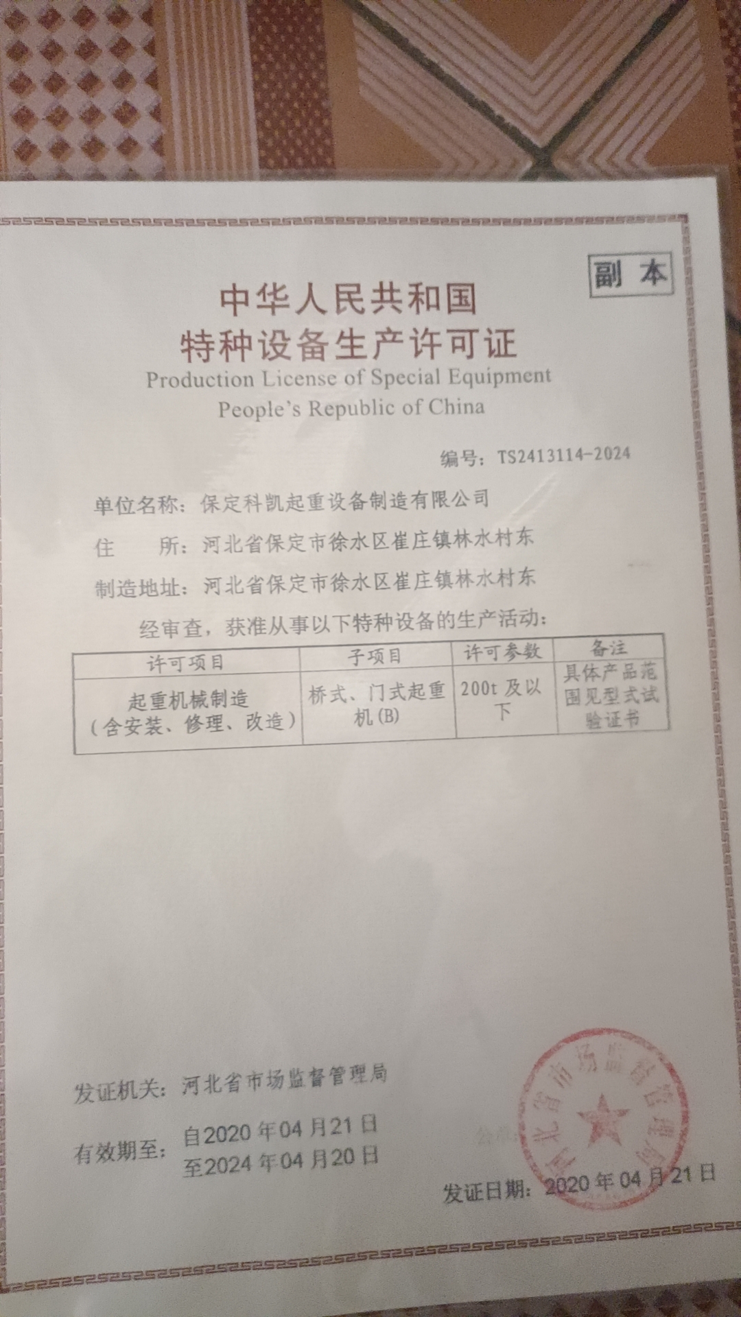 | 發(fā)證機(jī)構(gòu): | 河北省市場監(jiān)督管理局 | 發(fā)證時(shí)間 : | 2020-04-21 |