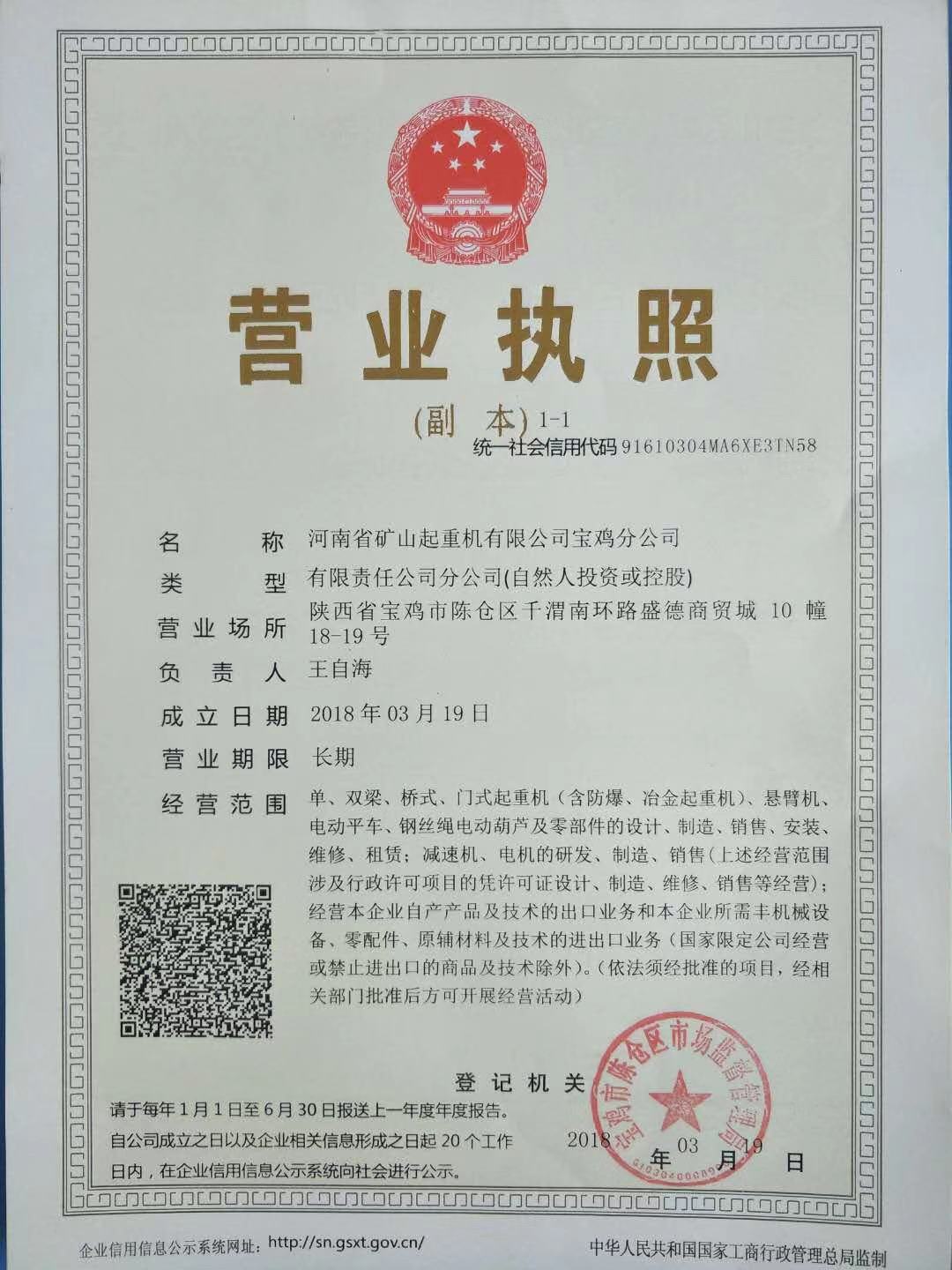 證書(shū)介紹 河南礦山起重機(jī)有限公司寶雞分公司營(yíng)業(yè)執(zhí)照