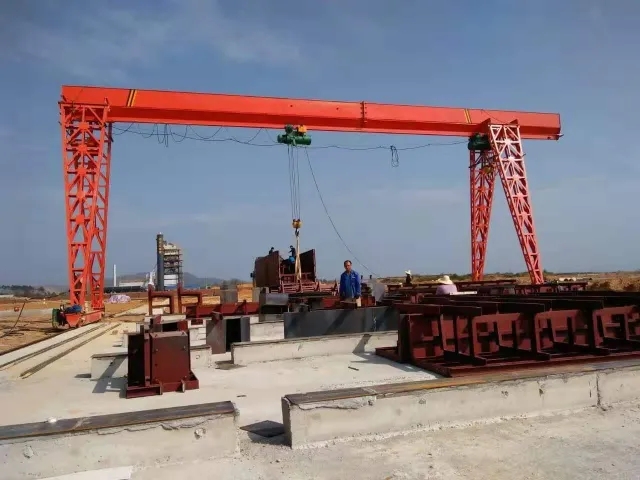 它的金屬結(jié)構(gòu)像門形框架,承載主梁下安裝兩條支腳,可以直接在地面的軌道上行走,主梁兩端可以具有外伸懸臂梁。