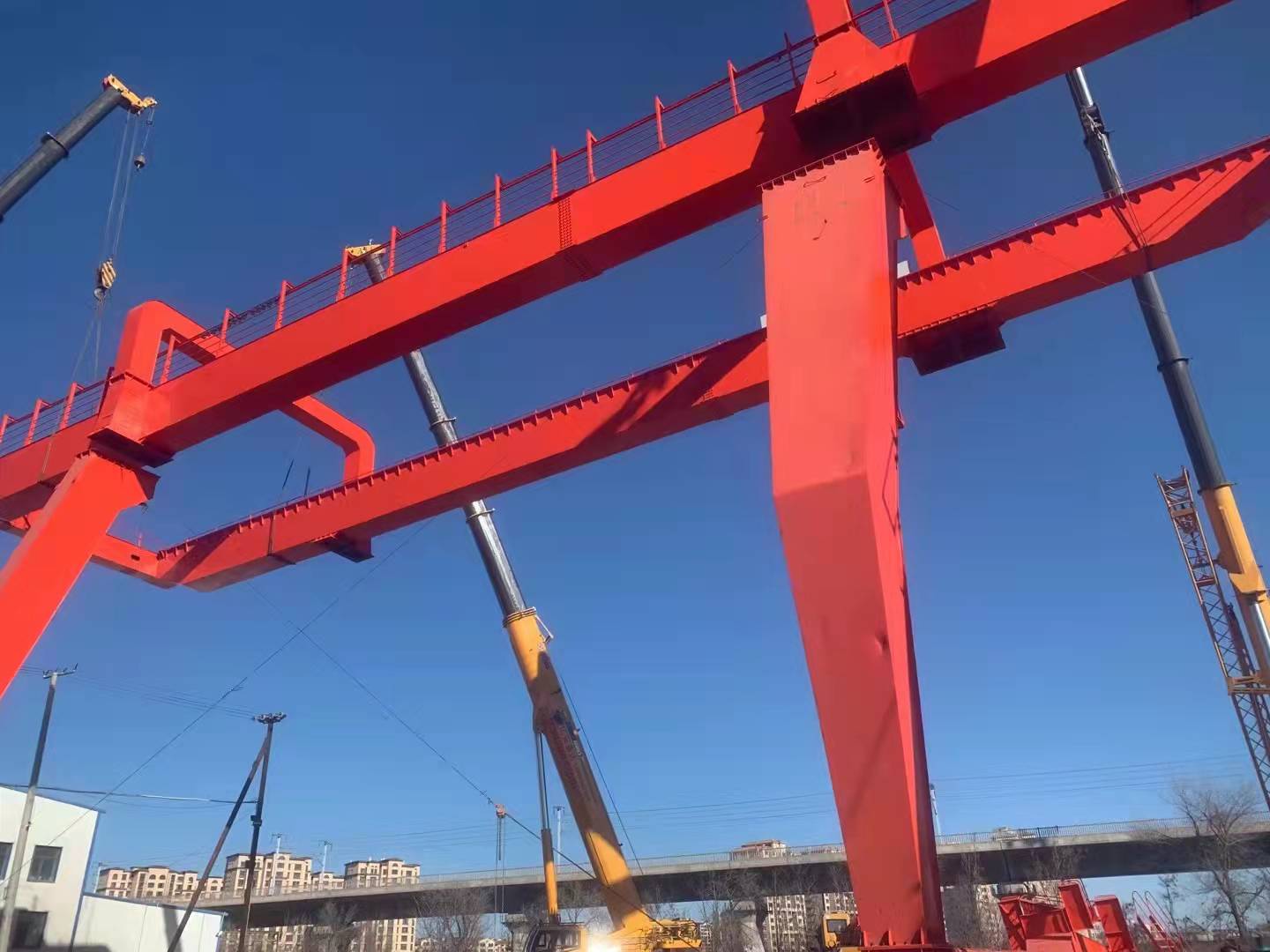 它的金屬結(jié)構(gòu)像門形框架,承載主梁下安裝兩條支腳,可以直接在地面的軌道上行走,主梁兩端可以具有外伸懸臂梁。