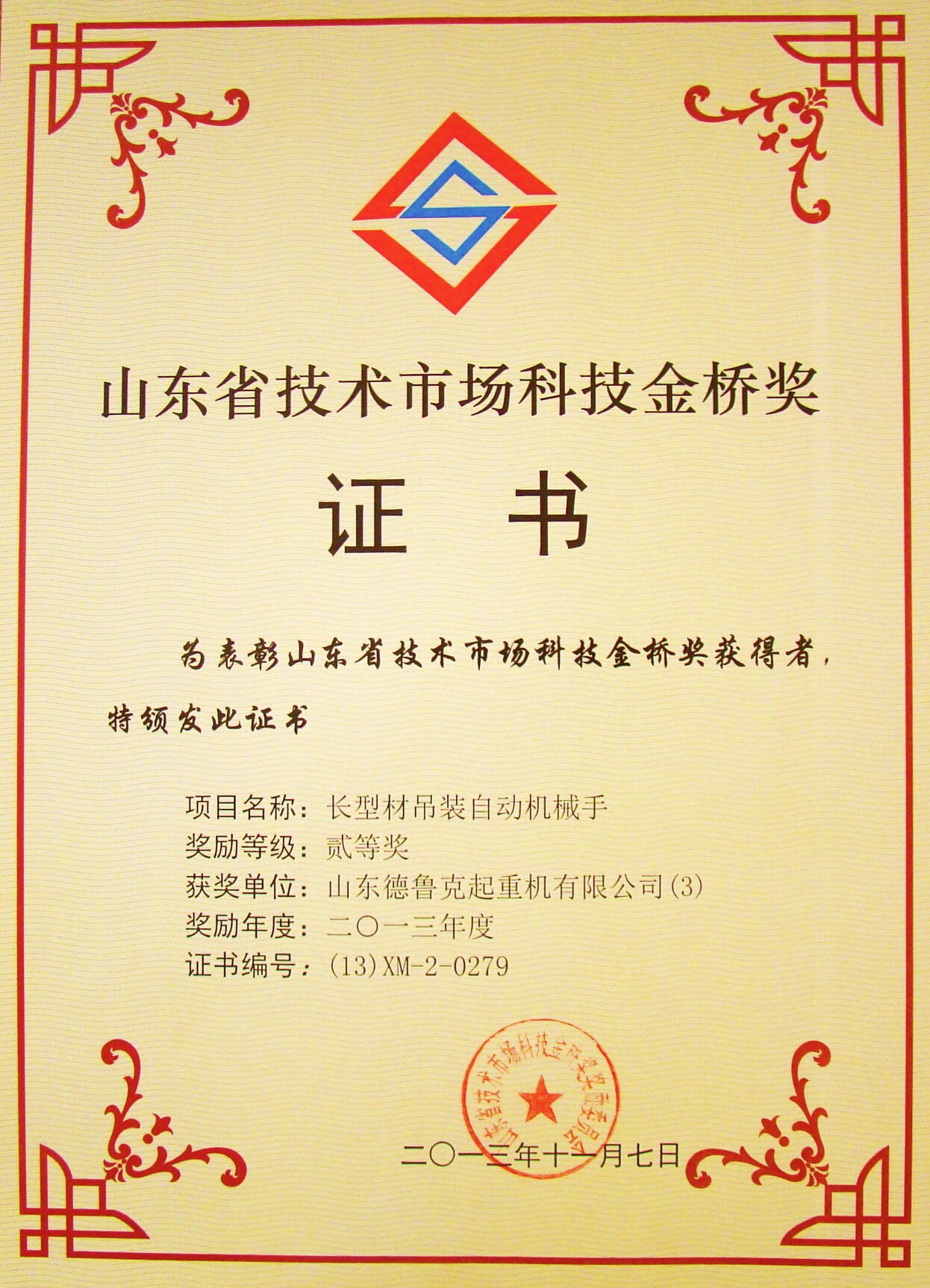 | 發(fā)證機(jī)構(gòu): | 山東省技術(shù)市場科技金橋獎(jiǎng)獎(jiǎng)勵(lì)委員會(huì) | 發(fā)證時(shí)間 : | 2013-11-07 |