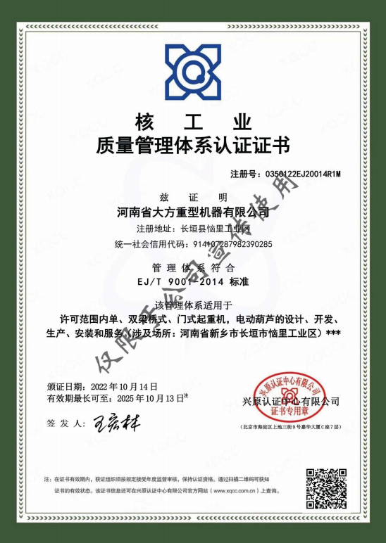 » 核工業(yè)質(zhì)量管理體系認證證書