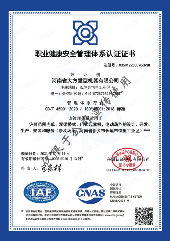 職業(yè)健康安全管理體系認證證書
