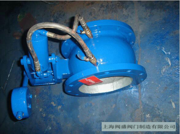 本閥主要由閥體、蝶板、調(diào)節(jié)閥、緩沖液壓缸等組成。外部由調(diào)節(jié)閥連接。當水泵啟動時,閥板在進口端水力和驅(qū)動液壓缸下腔水力作用下緩慢開啟至全開。關閉時介質(zhì)回流推動閥板和活塞上腔回水壓力的作用下迅速關閉90%截斷大部分水流,再由緩閉液壓缸阻尼進行緩閉,減弱回水壓力的沖擊,消除破壞性水錘。