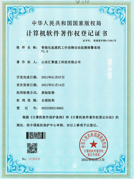 榮譽(yù)資質(zhì) 智能化起重機(jī)工作故障自動(dòng)監(jiān)測(cè)報(bào)警系統(tǒng) v1.0(自動(dòng)化證書(shū))