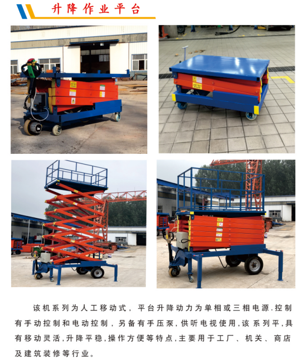 有移動靈活.升降平穩(wěn),操作方便等特點(diǎn),主要用于工廠、機(jī)關(guān)、商店
