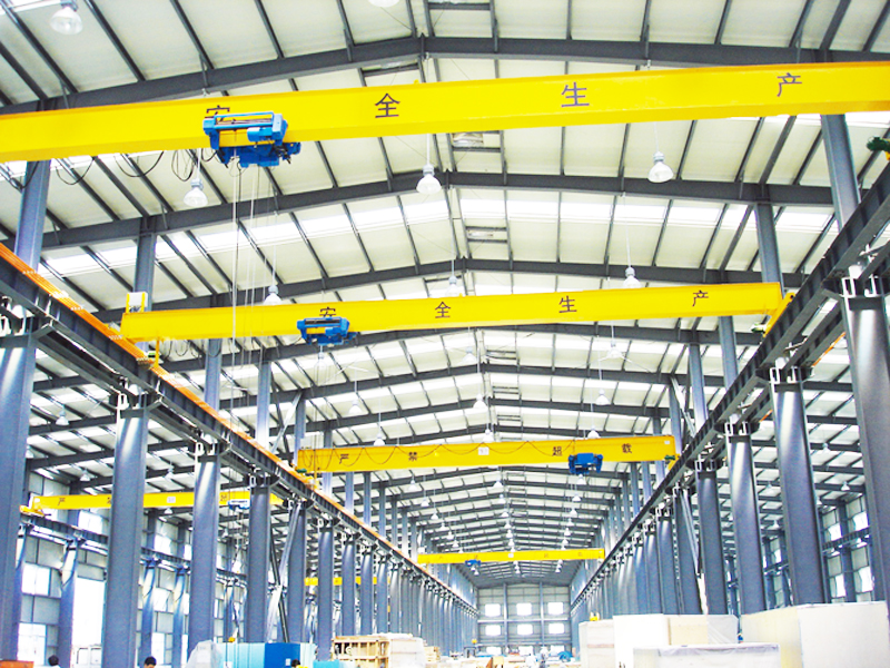 該型號起重機(jī)是我公司在引進(jìn)和消化國外先進(jìn)技術(shù)的基礎(chǔ)上,以模塊化設(shè)計(jì)理論為指導(dǎo),以現(xiàn)代計(jì)算機(jī)技術(shù)為手段,引入優(yōu)化設(shè)計(jì)及可靠性設(shè)計(jì)方法,采用進(jìn)口配置、新材料、新工藝完成的具有輕量化、通用化、節(jié)能環(huán)保、免維護(hù)及高技術(shù)含量的新型起重機(jī)。主梁及端梁為焊接箱型梁結(jié)構(gòu),下翼緣板作為電動(dòng)葫蘆運(yùn)行軌道,主梁與端梁采用高強(qiáng)度螺栓聯(lián)接,便于運(yùn)輸及現(xiàn)場安裝。起升機(jī)構(gòu)采用新型電動(dòng)葫蘆,結(jié)構(gòu)緊湊,易于維護(hù)。