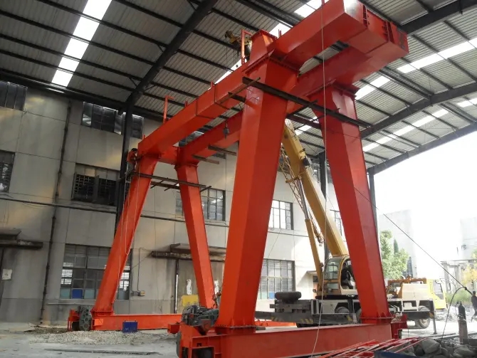它的金屬結(jié)構(gòu)像門形框架,承載主梁下安裝兩條支腳,可以直接在地面的軌道上行走,主梁兩端可以具有外伸懸臂梁。