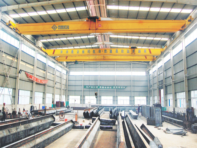 本產(chǎn)品由箱形主梁、端梁、小車及運(yùn)行機(jī)構(gòu)組成,電動葫蘆安裝在角型小車上作為起升機(jī)構(gòu),角型小車采用偏掛形式布置在主梁一側(cè)運(yùn)行,小車設(shè)有上、下水平輪,與垂直行走輪呈三點(diǎn)布置。電動葫蘆位置由傳統(tǒng)的主梁下提升到主梁上側(cè),有效提高了起升高度。小車運(yùn)行為錐型電機(jī)制動,開式齒輪傳動。主梁為箱型結(jié)構(gòu),偏軌,上、下設(shè)水平輪,安全可靠,并可防止啃軌。大車運(yùn)行采用分別驅(qū)動形式,錐型電機(jī)制動,開式齒輪傳動。