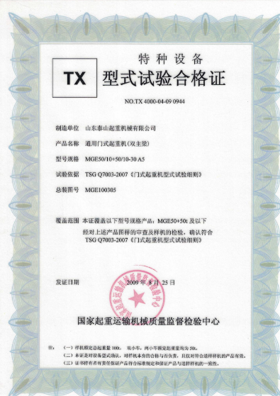 榮譽(yù)資質(zhì) 通用門式起重機(jī)(雙主梁) MGE50/10+5010-30A5