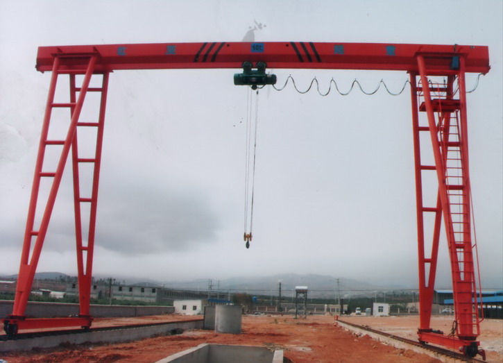 它的金屬結(jié)構(gòu)像門形框架,承載主梁下安裝兩條支腳,可以直接在地面的軌道上行走,主梁兩端可以具有外伸懸臂梁。