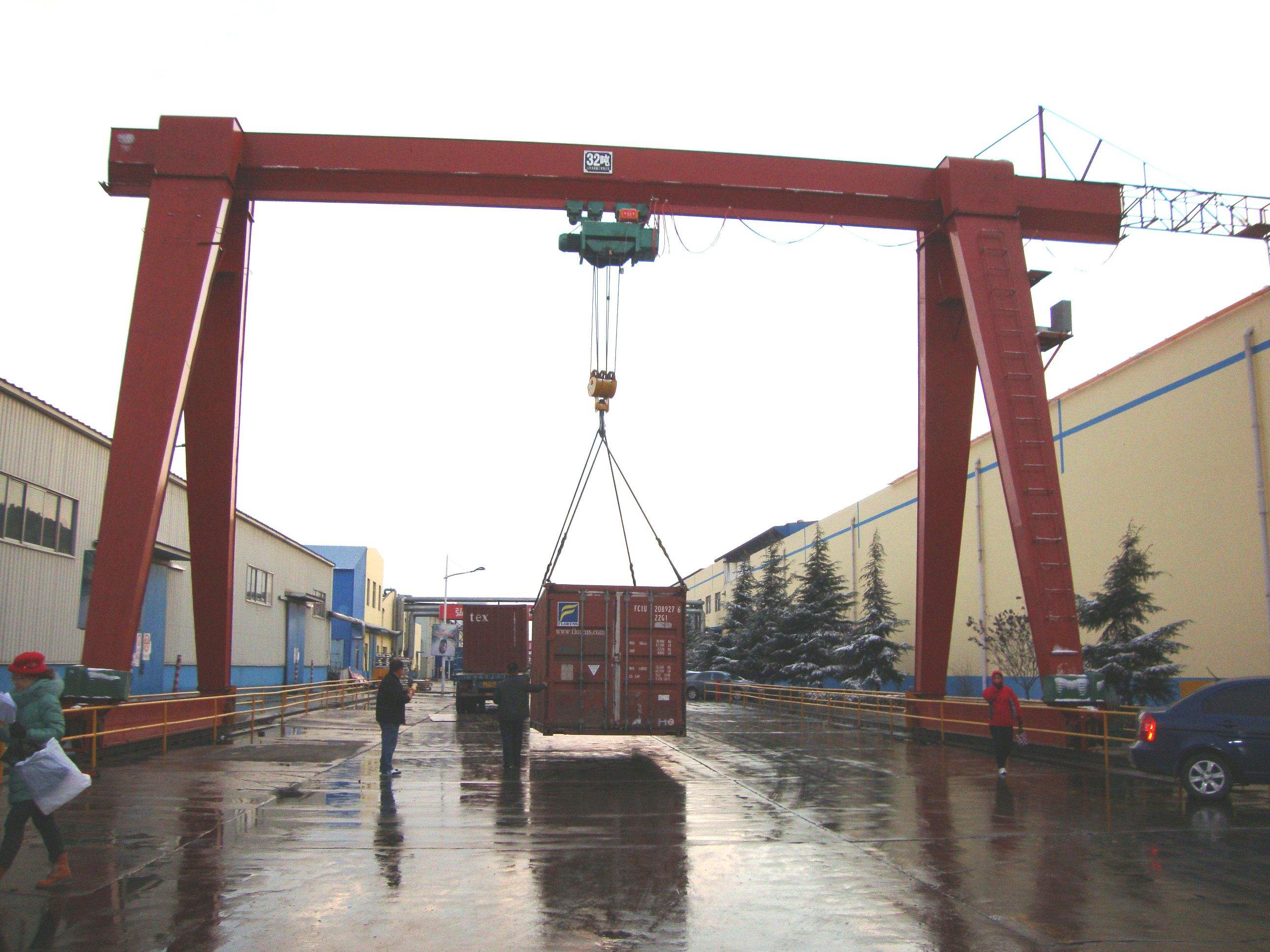 門式起重機(jī)是橋式起重機(jī)的一種變形,又叫龍門吊。主要用于室外的貨場、料場貨、散貨的裝卸作業(yè)。它的金屬結(jié)構(gòu)像門形框架,承載主梁下安裝兩條支腳,可以直接在地面的軌道上行走,主梁兩端可以具有外伸懸臂梁。門式起重機(jī)具有場地利用率高、作業(yè)范圍大、適應(yīng)面廣、通用性強(qiáng)等特點(diǎn),在港口貨場得到廣泛使用。