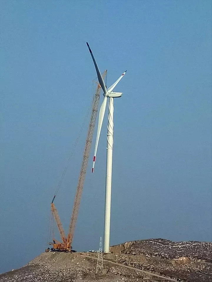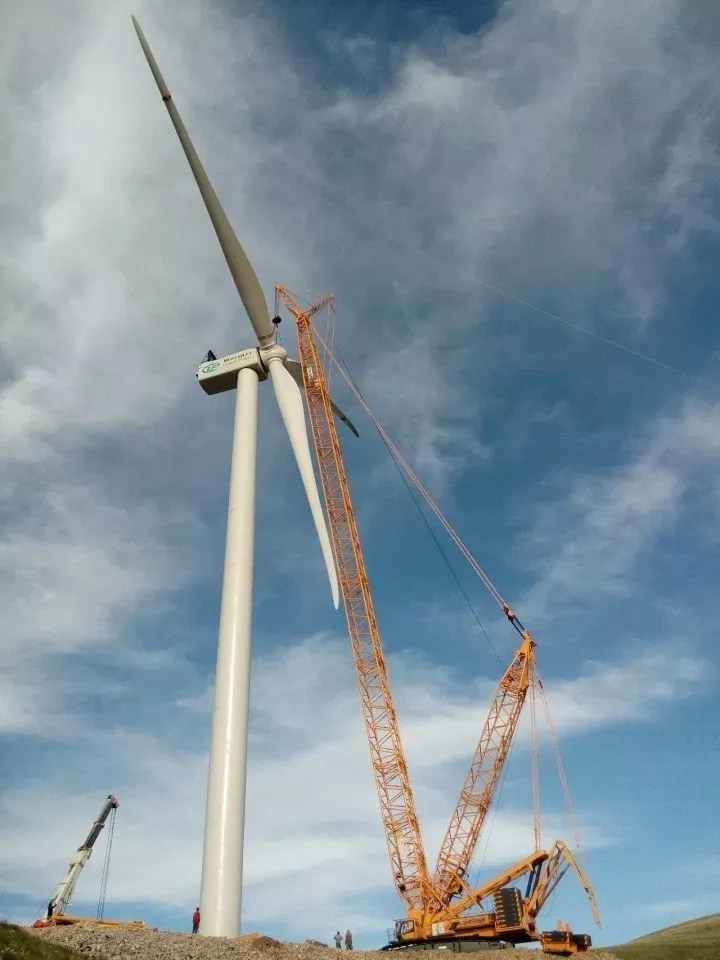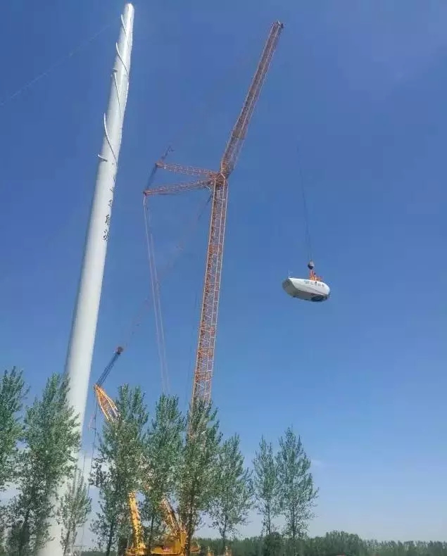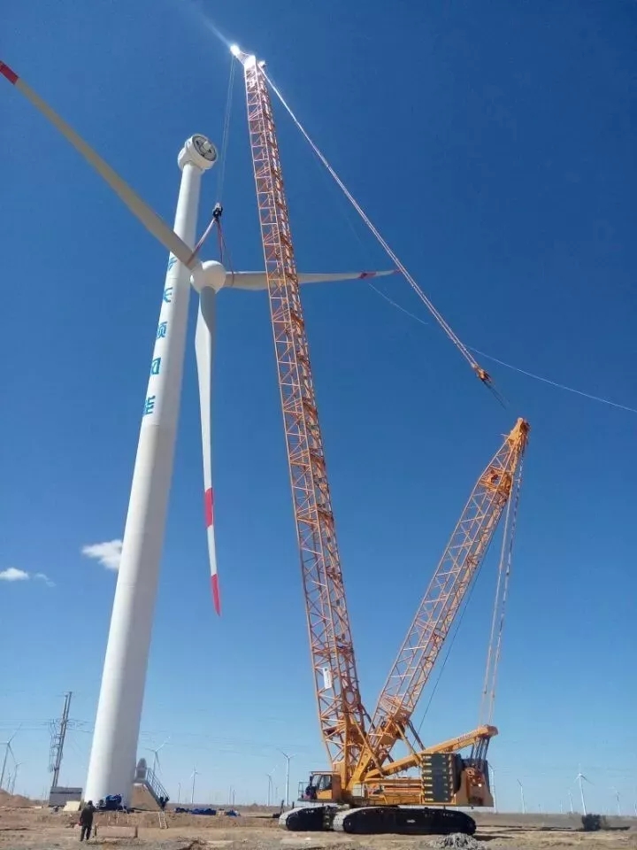 2017年河南蘭考某風(fēng)場,徐工1250噸級的XGC16000履帶起重機(jī)將一臺遠(yuǎn)景2.2MW風(fēng)機(jī)機(jī)艙成功吊裝至140米高的塔筒上。