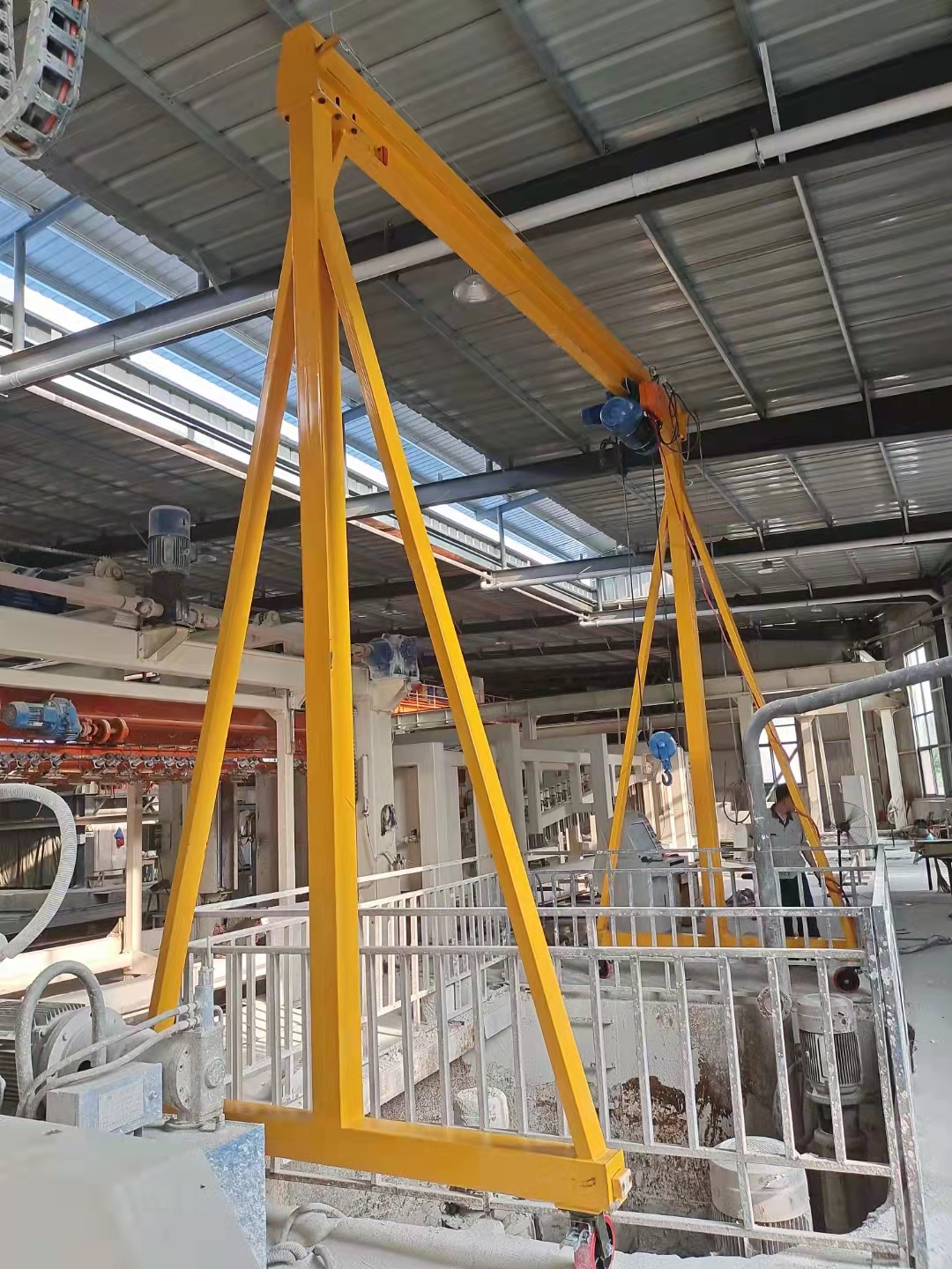 本實(shí)用新型涉及一種移動(dòng)式龍門吊,包括兩個(gè)行吊立梁,焊接在立梁上帶有軌道的上梁,在上梁軌道上運(yùn)動(dòng)的電動(dòng)葫蘆,其特征在于:所述的行吊立梁由立梁前腿與立梁后腿組成,立梁前腿底部設(shè)置有定向輪,立梁后腿底部設(shè)置有萬向輪,本實(shí)用新型技術(shù)和現(xiàn)有技術(shù)相比,結(jié)構(gòu)簡單,體積小,造價(jià)低,使用范圍廣.