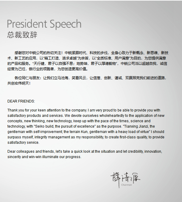 感謝您對(duì)中銳公司的熱切關(guān)注!中銳緊跟時(shí)代、科技的步伐,全身心致力于新概念、新思維、新技術(shù)、新工藝的應(yīng)用,以“精工打造、追求**”為宗旨,以“全質(zhì)標(biāo)準(zhǔn)、用戶滿意”為目的,為您提供滿意的產(chǎn)品和服務(wù)。“天行健,君子以自強(qiáng)不息;地勢(shì)坤,君子以厚德載物”,中銳公司當(dāng)以超越自我,誠(chéng)信經(jīng)營(yíng)為己任,做行業(yè)的領(lǐng)跑者,為您創(chuàng)造更高**。