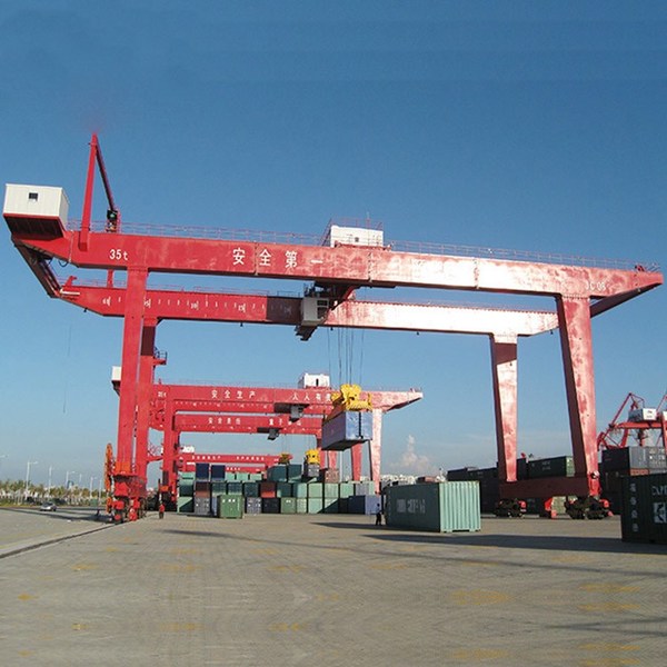龍門吊即門式起重機,是橋式起重機的一種變形,在港口主要用于室外的貨場、料場貨、散貨的裝卸作業(yè)。它的金屬結(jié)構(gòu)像門形框架,承載主梁下安裝兩條支腳,可以直接在地面的軌道上行走,主梁兩端可以具有外伸懸臂梁。龍門吊具有場地利用率高、作業(yè)范圍大、適應(yīng)面廣、通用性強等特點,在港口貨場得到廣泛使用。龍門吊門式起重機在港口碼頭、造船廠、大型工業(yè)企業(yè)、建筑工程以及物流倉儲等領(lǐng)域得到廣泛的應(yīng)用,能夠提高生產(chǎn)效率、降低勞動強度、保證生產(chǎn)安全。