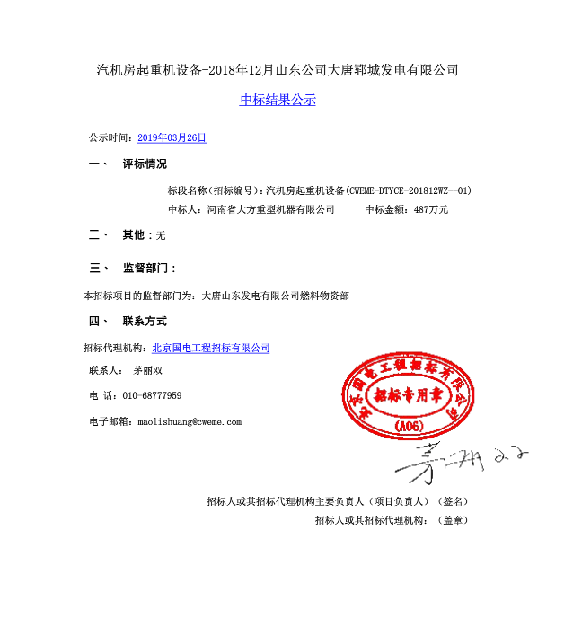 移動版:【汽機房起重機設(shè)備、電子稱重皮帶式給煤機設(shè)備-2018年12月山東公司大唐鄆城發(fā)電有限公司】中標(biāo)結(jié)果公示