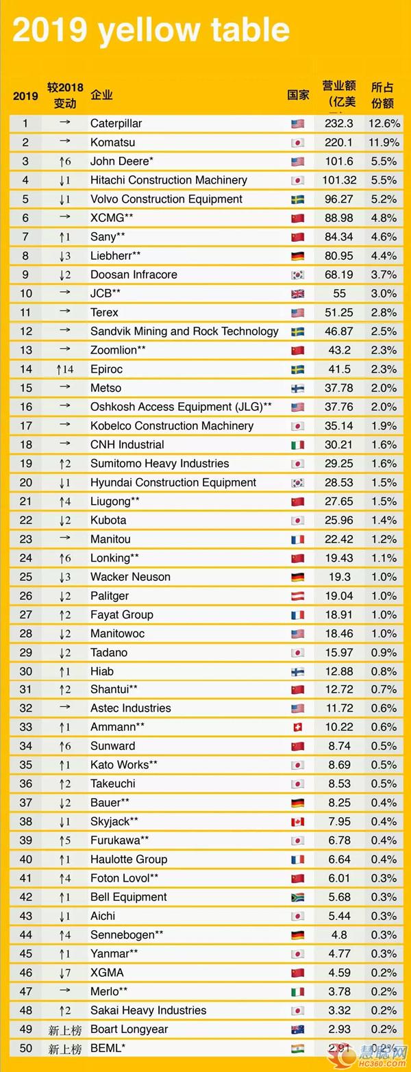 2019年全球工程機(jī)械制造商50強(qiáng)排行榜