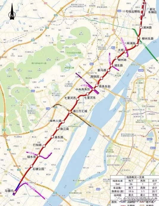 南京地鐵11號(hào)線一期工程整體呈西南-東北走向,南起馬騾圩站,北至浦洲路站,線路全長(zhǎng)約27km,其中:高架段長(zhǎng)約1km,過渡段長(zhǎng)約0.4km,地下段長(zhǎng)約25.6km,全線設(shè)車站20座(其中換乘站7座),其中高架站1座,地下站19座,最大站間距3.56km(馬騾圩站至石塘路公園站),最小站間距0.61km(新馬路站至浦東路站),平均站間距約1.4km。設(shè)車輛段1座,控制中心1座,主變電所2座。采用A型車、6輛編組,設(shè)計(jì)時(shí)速80km。工程建設(shè)期5年。