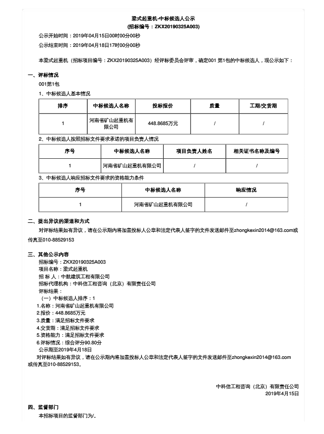 梁式起重機(jī)-中標(biāo)候選人公示