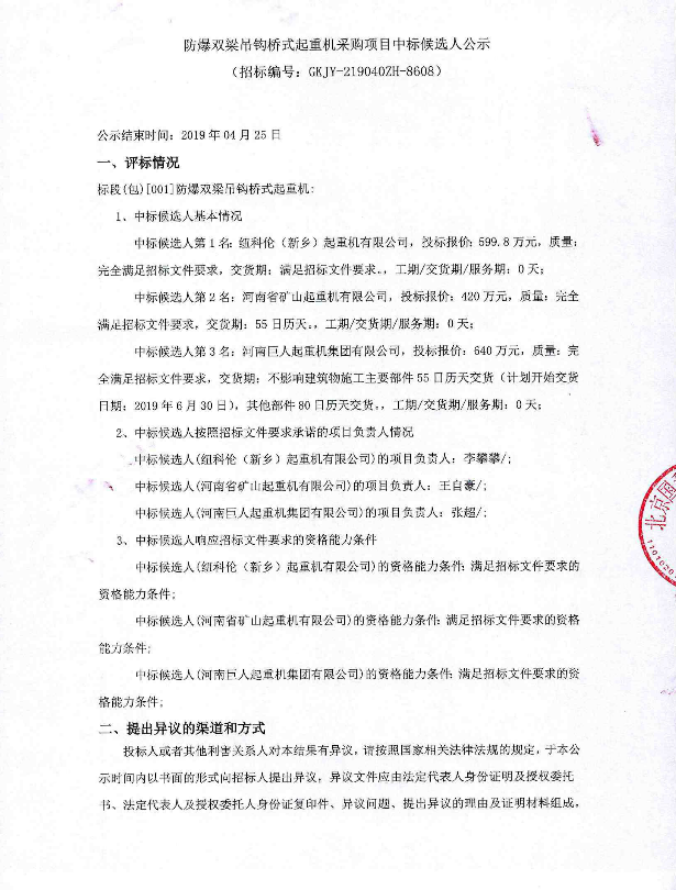 防爆雙梁吊鉤橋式起重機采購項目中標(biāo)候選人公示