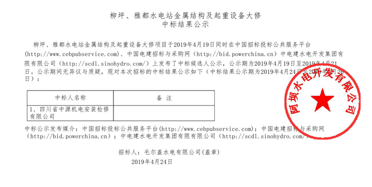 柳坪水電站柳坪雅都水工機械設備及起重設備大修中標結果公示