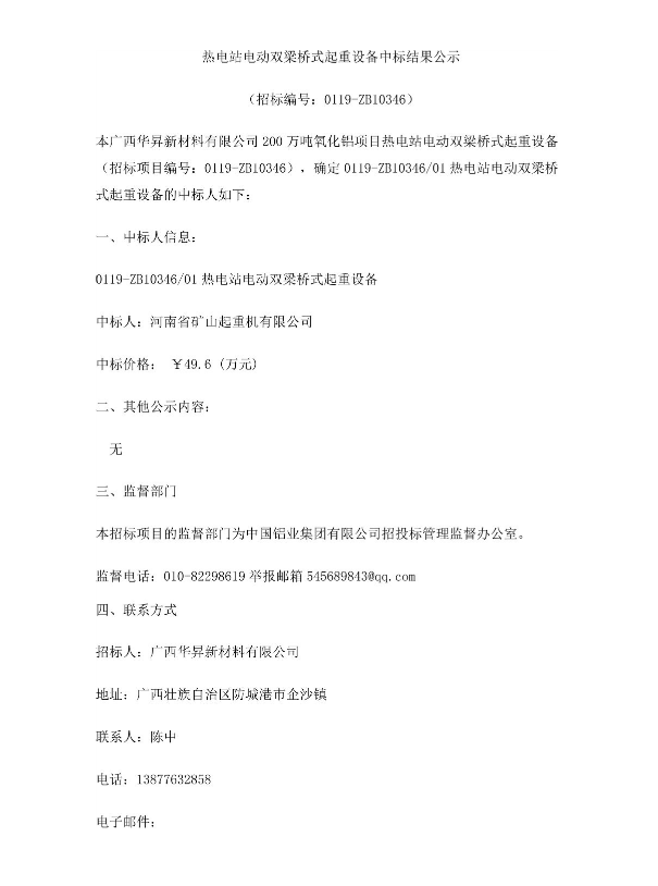 熱電站電動雙梁橋式起重設(shè)備中標(biāo)公示