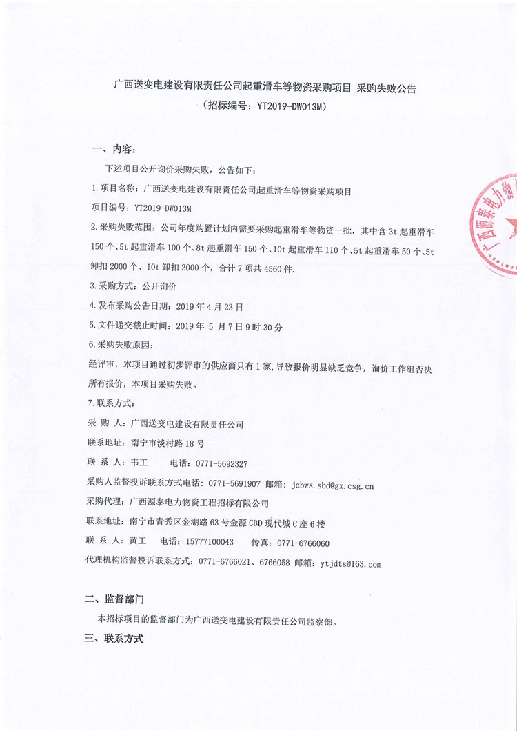 廣西送變電建設(shè)有限責(zé)任公司起重滑車(chē)等物資采購(gòu)項(xiàng)目 采購(gòu)失敗公告