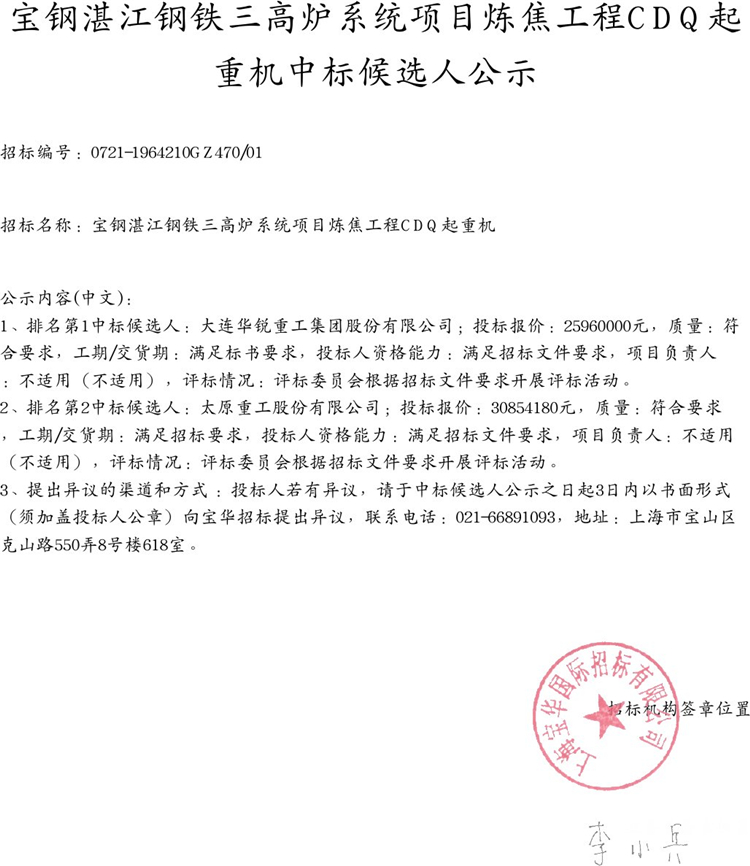 寶鋼湛江鋼鐵三高爐系統(tǒng)項(xiàng)目煉焦工程CDQ起重機(jī)中標(biāo)候選人公示