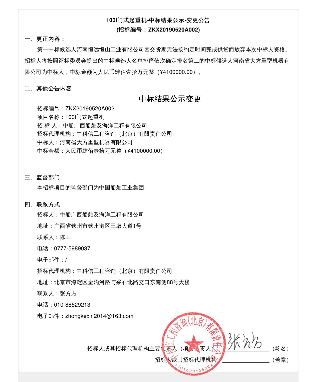 100t門式起重機(jī)-中標(biāo)結(jié)果公示-變更公告