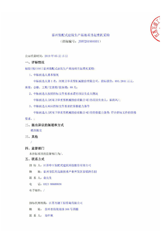 泰州裝配式建筑生產(chǎn)基地項(xiàng)目起重機(jī)采購中標(biāo)公告