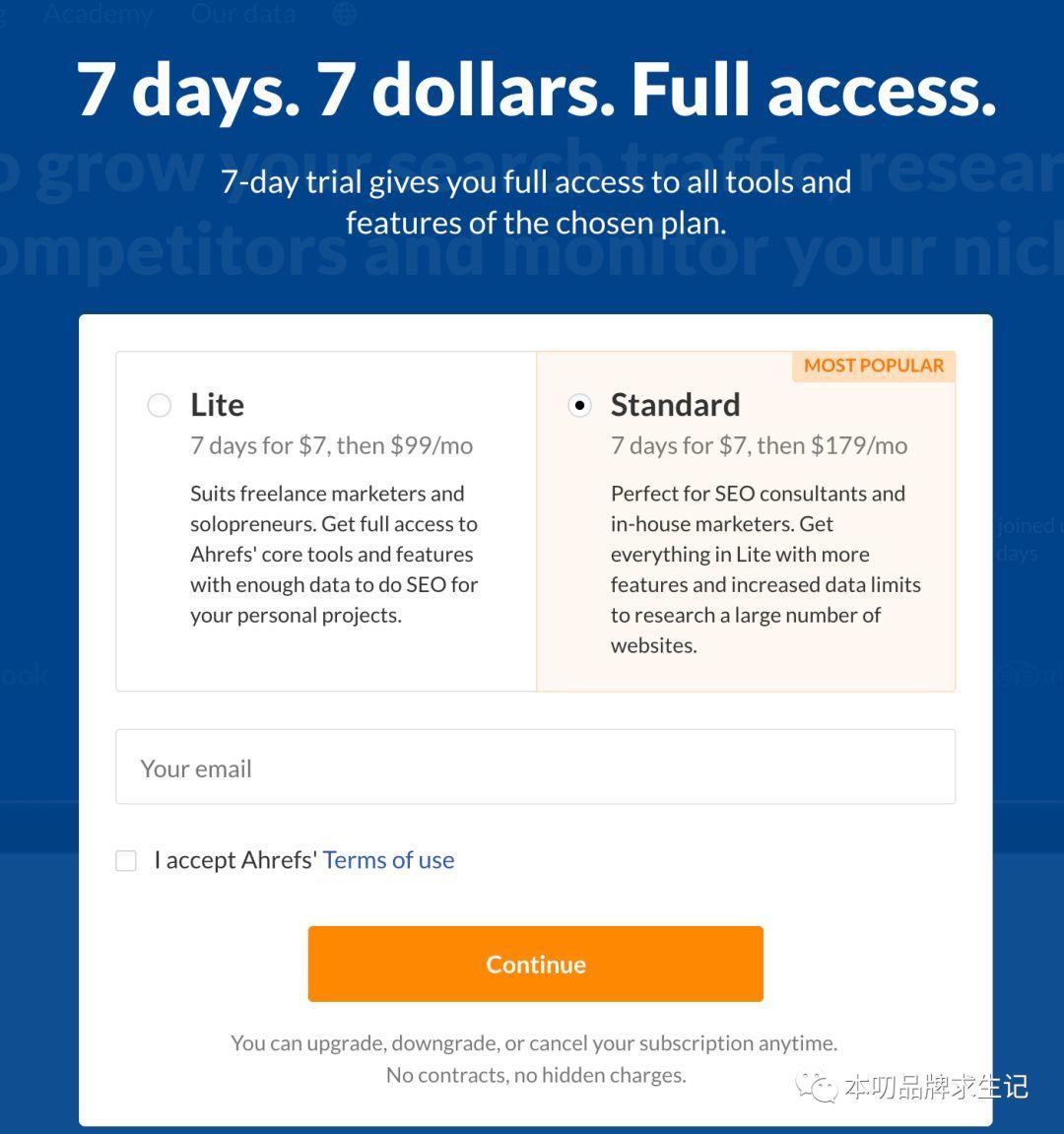比如:Ahref這種低價(jià)限時(shí)付費(fèi)試用,看似是全功能的,個(gè)人版其實(shí)就是部分核心功能的受限制組合,面向的是自由職業(yè)者和個(gè)人事業(yè)主,標(biāo)準(zhǔn)版面向的是企業(yè)。