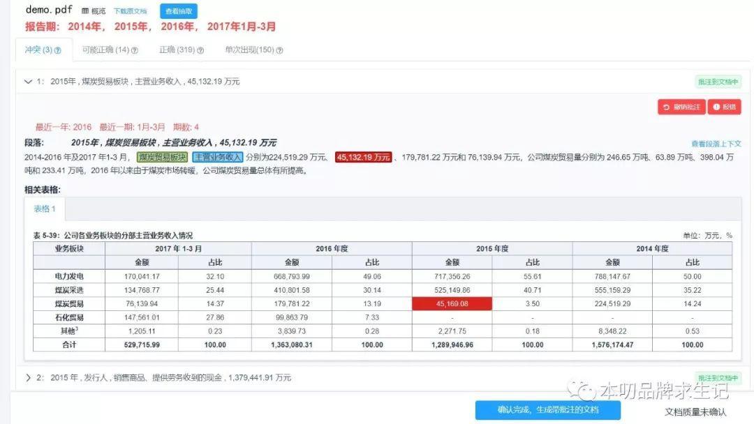 用戶只需上傳一個(gè)Word格式的 “債券募集說(shuō)明書”,過(guò)大約半個(gè)小時(shí),這一功能就能自動(dòng)找到募集說(shuō)明書里財(cái)務(wù)數(shù)據(jù)可能的錯(cuò)誤和沖突,一條一條的列出來(lái)供用戶復(fù)核。